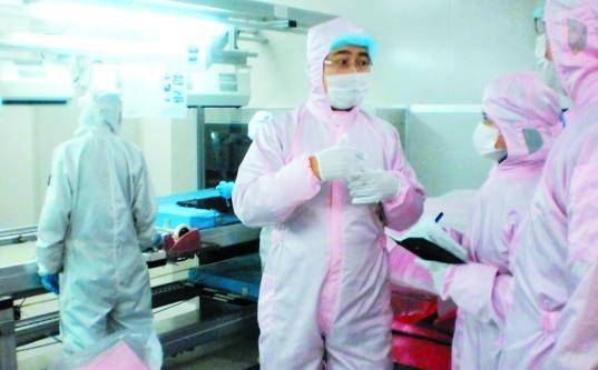 穿上寬大的連體無塵服,戴好防塵手套和帽子,把褲腳扎進鞋套,套上口罩。經過一番“全副武裝”,記者被風淋室的潔凈強風吹除身體塵埃之后,得以進入貴陽海信新建的模組車間,一窺企業最神秘的生產場所。