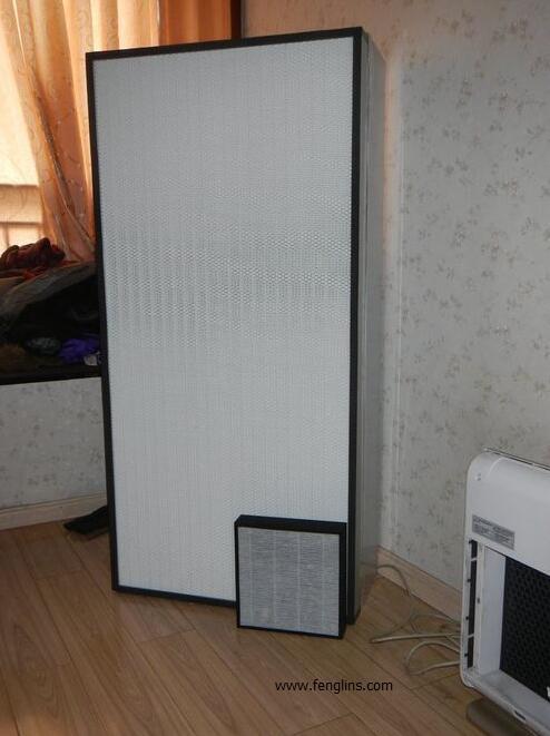 前后兩部分組成,后面是風機組件,前面是一塊大號兒高效濾清材料。出廠時,廠家就已經將兩部分固定好了。過濾器,長一米二寬六十左右,厚度七十毫米厚,差不多是家用的3倍大,單獨買300左右,是其他家用凈化器濾材價格的5/1,和家用的比尺寸上是占了上風,過濾效果也相當理想,嘿嘿……網上說還需要用膠帶密封,其實里面都有密封橡膠圈。做不做看自己吧。